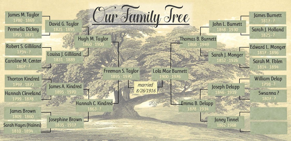 Our Family Tree is listed below as a graphic. Feel free to download it, and use it if you are "kin" to us. From this Family Tree, we have Ancestors (those included in this tree) and Descendants (those that descend from persons on these trees). Click on the a person's name to see that person's family tree and view their family photos. This is a work in progress. Any help you can give (simply email us) to add more persons to the family trees is invaluable! With your help, we can even move beyond the Taylor families and include their spouses and their family trees!